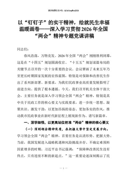 【七哥公文】2026年:以“钉钉子”的实干精神,绘就民生幸福温暖画卷——深入学习贯彻2026年全国“两会”精神专题党课讲稿+更多免费公文+VX:QiGeGongWen2024