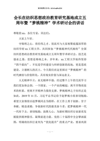 【七哥公文】2026年:会长在纺织思想政治教育研究基地成立五周年暨“梦桃精神”学术研讨会的讲话+更多免费公文+VX:QiGeGongWen2024