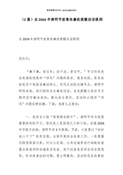 【七哥公文】2026年:(2篇)在2026年清明节前集体廉政提醒谈话提纲+更多免费公文+VX:QiGeGongWen2024