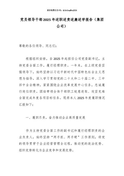 【七哥公文】2026年:党员领导干部2025年述职述责述廉述学报告(集团公司)_副本+更多免费公文+VX:QiGeGongWen2024