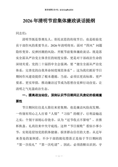/ 【七哥公文】2026年:2026年清明节前集体廉政谈话提纲+更多免费公文+VX:QiGeGongWen2024