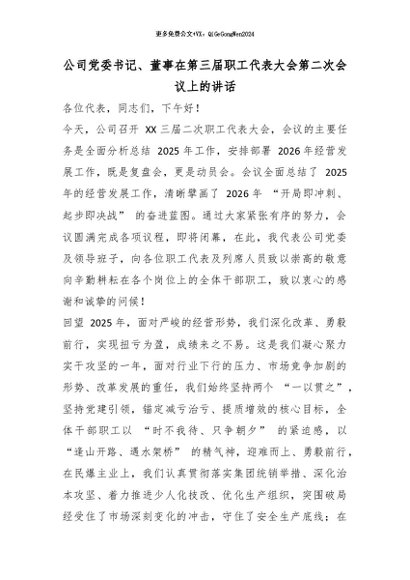 【七哥公文】2026年:公司党委书记、董事在第三届职工代表大会第二次会议上的讲话_副本+更多免费公文+VX:QiGeGongWen2024