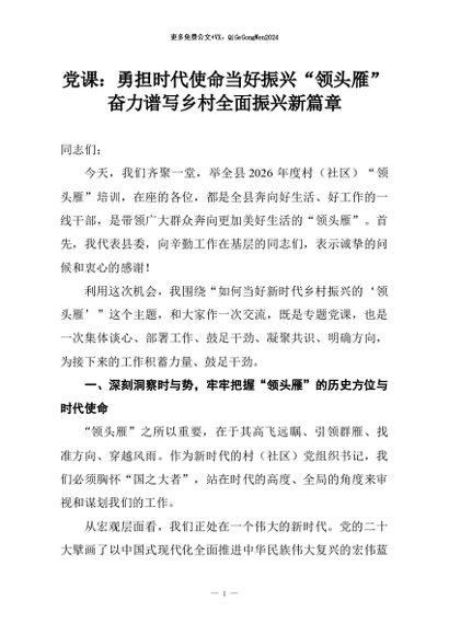 【七哥公文】2026年:党课:勇担时代使命当好振兴“领头雁”奋力谱写乡村全面振兴新篇章+更多免费公文+VX:QiGeGongWen2024