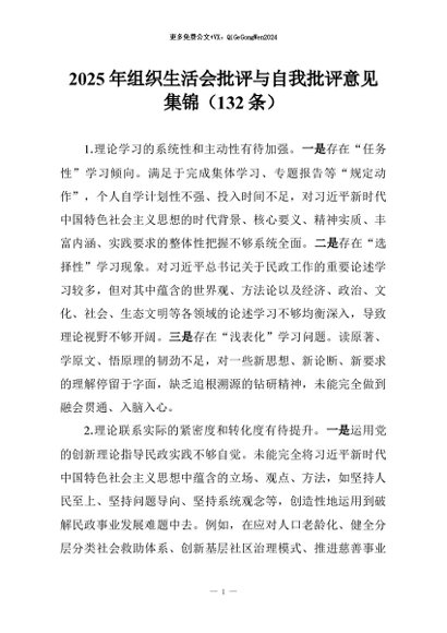 【七哥公文】2026年:2025年组织生活会批评与自我批评意见集锦(132条)+更多免费公文+VX:QiGeGongWen2024