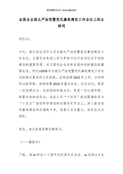 【七哥公文】2026年:在国企全面从严治党暨党风廉政建设工作会议上的主持词_副本+更多免费公文+VX:QiGeGongWen2024