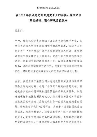 【七哥公文】2026年:在2026年机关党支部专题党课上的讲稿:深学细悟集团战略,凝心铸魂勇担使命_副本+更多免费公文+VX:QiGeGongWen2024