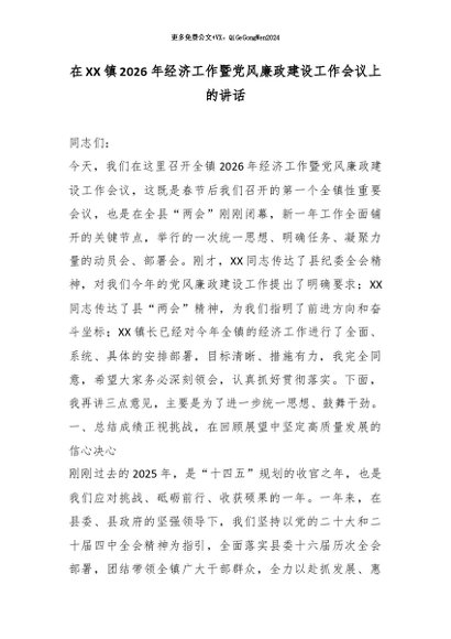 【七哥公文】2026年:在XX镇2026年经济工作暨党风廉政建设工作会议上的讲话_副本+更多免费公文+VX:QiGeGongWen2024