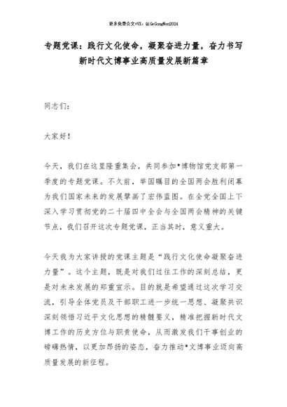 【七哥公文】2026年:专题党课:践行文化使命,凝聚奋进力量,奋力书写新时代文博事业高质量发展新篇章_副本+更多免费公文+VX:QiGeGongWen2024