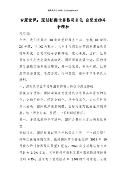 【七哥公文】2026年:专题党课:深刻把握世界格局变化 自觉发扬斗争精神_副本+更多免费公文+VX:QiGeGongWen2024