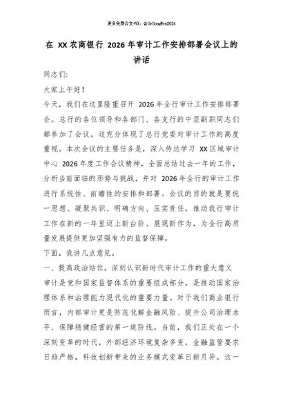 【七哥公文】2026年:在 XX 农商银行 2026 年审计工作安排部署会议上的讲话_副本+更多免费公文+VX:QiGeGongWen2024