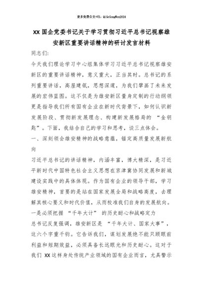 【七哥公文】2026年:XX 国企党委书记关于学习贯彻总书记视察雄安新区重要讲话精神的研讨发言材料_副本+更多免费公文+VX:QiGeGongWen2024