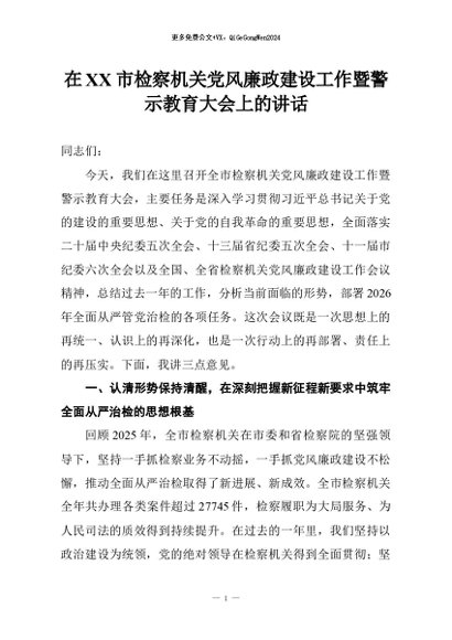【七哥公文】2026年:在XX市检察机关党风廉政建设工作暨警示教育大会上的讲话+更多免费公文+VX:QiGeGongWen2024