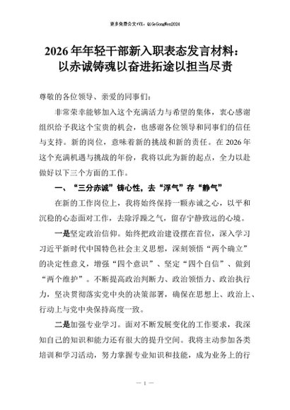 【七哥公文】2026年:2026年年轻干部新入职表态发言材料:以赤诚铸魂以奋进拓途以担当尽责+更多免费公文+VX:QiGeGongWen2024