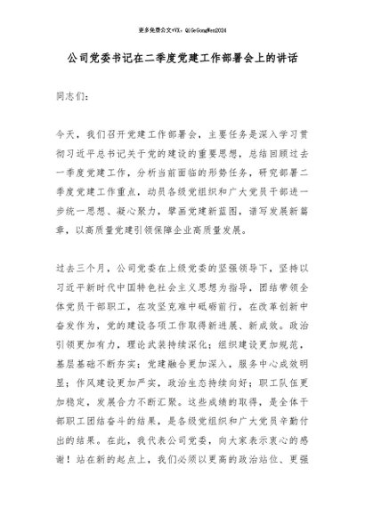 【七哥公文】2026年:公司党委书记在二季度党建工作部署会上的讲话_副本+更多免费公文+VX:QiGeGongWen2024