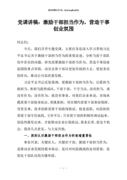 / 【七哥公文】2026年:党课讲稿:激励干部担当作为,营造干事创业氛围+更多免费公文+VX:QiGeGongWen2024