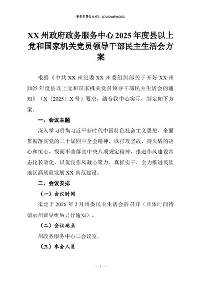 【七哥公文】2026年:XX州政府政务服务中心2025年度县以上党和国家机关党员领导干部民主生活会方案+更多免费公文+VX:QiGeGongWen2024