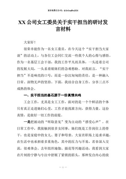 / 【七哥公文】2026年:XX公司女工委员关于实干担当的研讨发言材料+更多免费公文+VX:QiGeGongWen2024