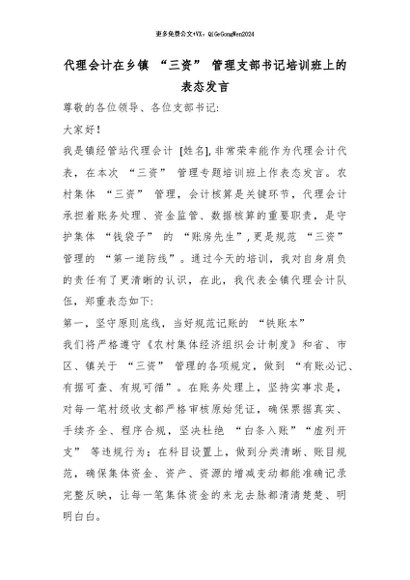 【七哥公文】2026年:代理会计在乡镇 “三资” 管理支部书记培训班上的表态发言_副本+更多免费公文+VX:QiGeGongWen2024