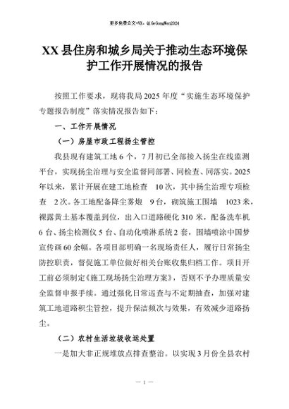 【七哥公文】2026年:XX县住房和城乡局关于推动生态环境保护工作开展情况的报告+更多免费公文+VX:QiGeGongWen2024