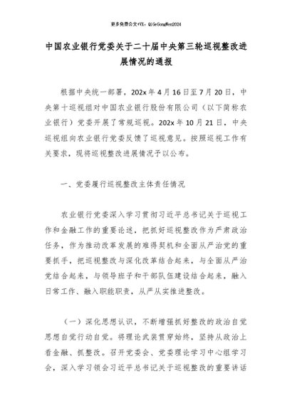 【七哥公文】2026年:中国农业银行党委关于二十届中央第三轮巡视整改进展情况的通报_副本+更多免费公文+VX:QiGeGongWen2024