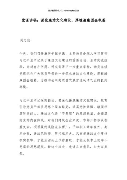 【七哥公文】2026年:党课讲稿:深化廉洁文化建设,厚植清廉国企根基_副本+更多免费公文+VX:QiGeGongWen2024