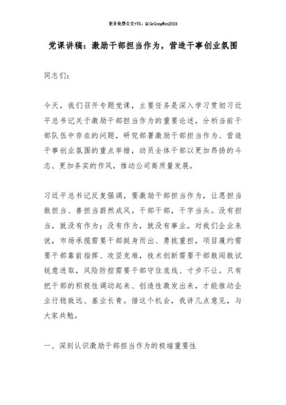 【七哥公文】2026年:党课讲稿:激励干部担当作为,营造干事创业氛围_副本+更多免费公文+VX:QiGeGongWen2024