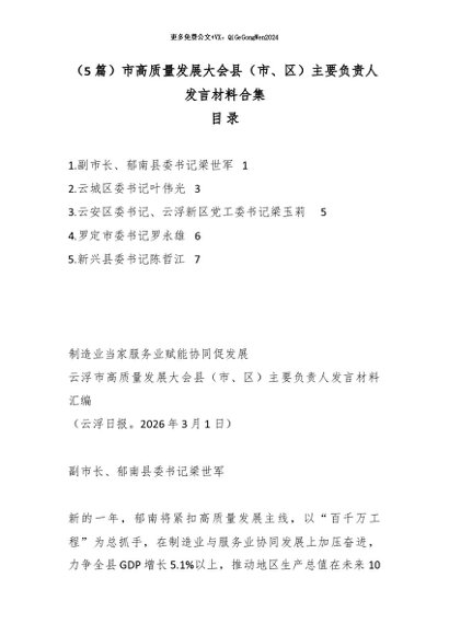 【七哥公文】2026年:(5篇)市高质量发展大会县(市、区)主要负责人发言材料合集+更多免费公文+VX:QiGeGongWen2024
