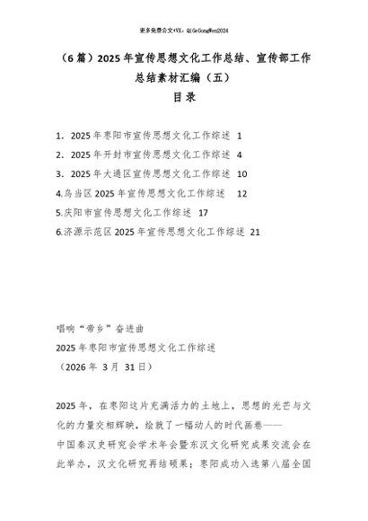 【七哥公文】2026年:(6篇)2025年宣传思想文化工作总结、宣传部工作总结素材汇编(五)+更多免费公文+VX:QiGeGongWen2024