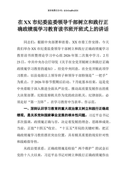 【七哥公文】2026年:在市纪委监委领导千部树立和践行正确政绩观学习教育读书班开班式上的讲话+更多免费公文+VX:QiGeGongWen2024