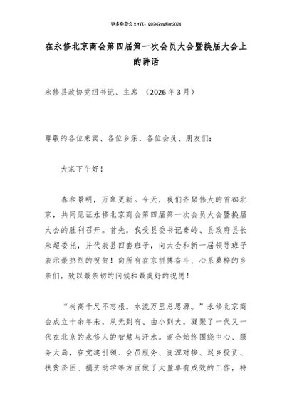 【七哥公文】2026年:在永修北京商会第四届第一次会员大会暨换届大会上的讲话_副本+更多免费公文+VX:QiGeGongWen2024