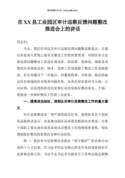 / 【七哥公文】2026年:在县工业园区审计巡察反馈问题整改推进会上的讲话+更多免费公文+VX:QiGeGongWen2024