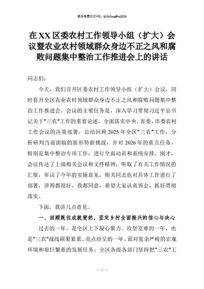 【七哥公文】2026年:在XX区委农村工作领导小组(扩大)会议暨农业农村领域群众身边不正之风和腐败问题集中整治工作推进会上的讲话+更多免费公文+VX:QiGeGongWen2024