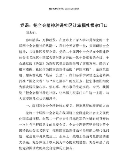 / 【七哥公文】2026年:党课:把四中全会精神种进社区让幸福扎根家门口+更多免费公文+VX:QiGeGongWen2024