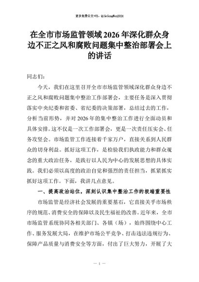【七哥公文】2026年:在全市市场监管领域2026年深化群众身边不正之风和腐败问题集中整治部署会上的讲话+更多免费公文+VX:QiGeGongWen2024