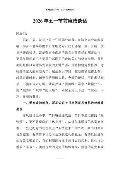 / 【七哥公文】2026年:2026年五一节前廉政谈话+更多免费公文+VX:QiGeGongWen2024
