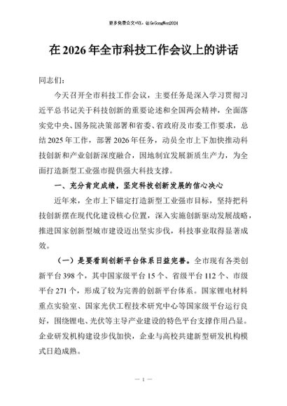 / 【七哥公文】2026年:在2026年全市科技工作会议上的讲话+更多免费公文+VX:QiGeGongWen2024