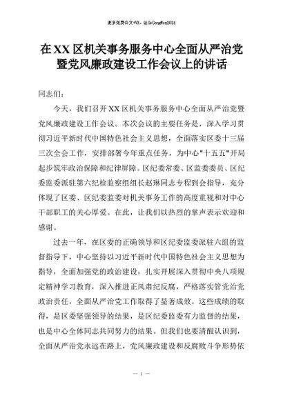 【七哥公文】2026年:在XX区机关事务服务中心全面从严治党暨党风廉政建设工作会议上的讲话+更多免费公文+VX:QiGeGongWen2024