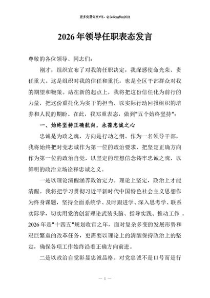 / 【七哥公文】2026年:2026年领导任职表态发言+更多免费公文+VX:QiGeGongWen2024