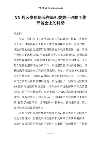 【七哥公文】2026年:XX县公安局局长在局机关关于巡察工作部署会上的讲话+更多免费公文+VX:QiGeGongWen2024