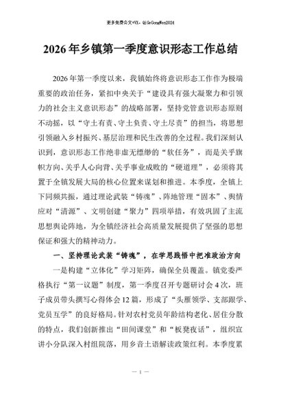 / 【七哥公文】2026年:2026年乡镇第一季度意识形态工作总结+更多免费公文+VX:QiGeGongWen2024