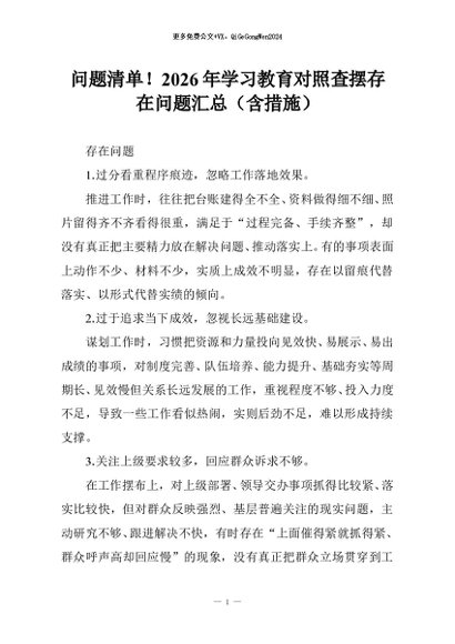 【七哥公文】2026年:问题清单!2026年学习教育对照查摆存在问题汇总(含措施)+更多免费公文+VX:QiGeGongWen2024