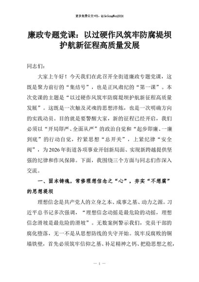 【七哥公文】2026年:廉政专题党课:以过硬作风筑牢防腐堤坝护航新征程高质量发展+更多免费公文+VX:QiGeGongWen2024