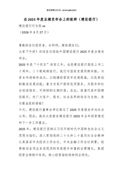 【七哥公文】2026年:在2025年度业绩发布会上的致辞(建设银行)_副本+更多免费公文+VX:QiGeGongWen2024