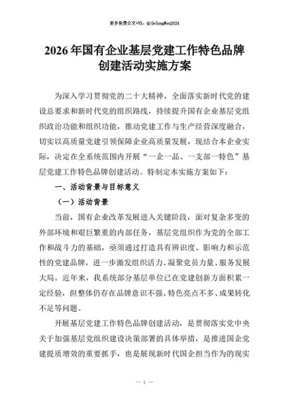 【七哥公文】2026年:2026年国有企业基层党建工作特色品牌创建活动实施方案+更多免费公文+VX:QiGeGongWen2024