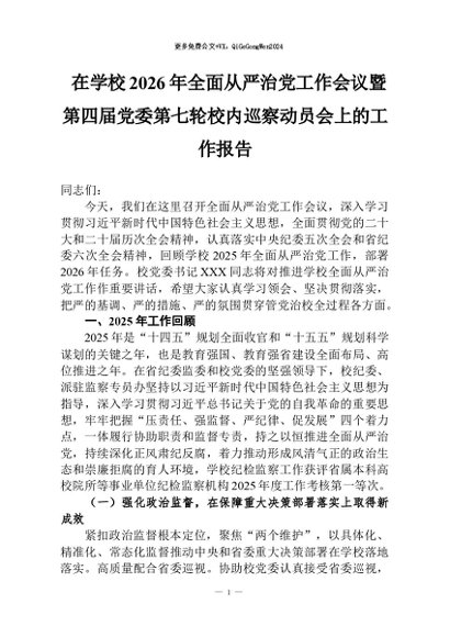 【七哥公文】2026年:在学校2026年全面从严治党工作会议暨第四届党委第七轮校内巡察动员会上的工作报告+更多免费公文+VX:QiGeGongWen2024