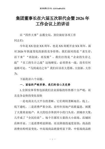 【七哥公文】2026年:集团董事长在六届五次职代会暨2026年工作会议上的讲话+更多免费公文+VX:QiGeGongWen2024