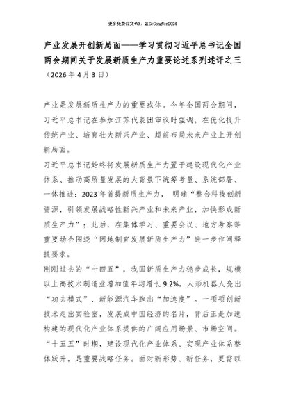 【七哥公文】2026年:产业发展开创新局面——学习贯彻总书记全国两会期间关于发展新质生产力重要论述系列述评之三_副本+更多免费公文+VX:QiGeGongWen2024