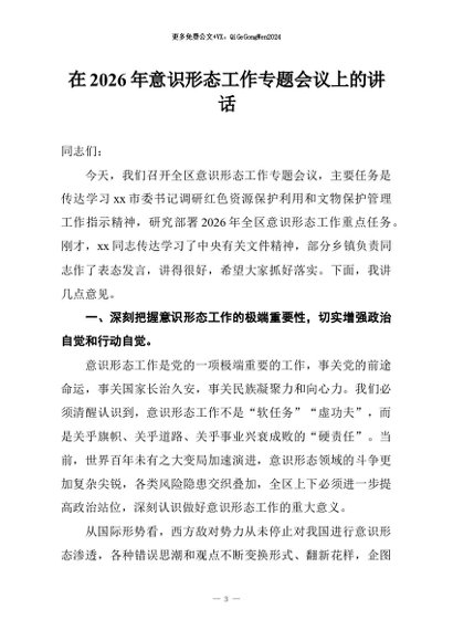 / 【七哥公文】2026年:在2026年意识形态工作专题会议上的讲话+更多免费公文+VX:QiGeGongWen2024