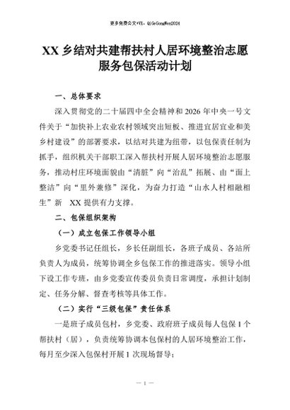 【七哥公文】2026年:XX乡结对共建帮扶村人居环境整治志愿服务包保活动计划+更多免费公文+VX:QiGeGongWen2024