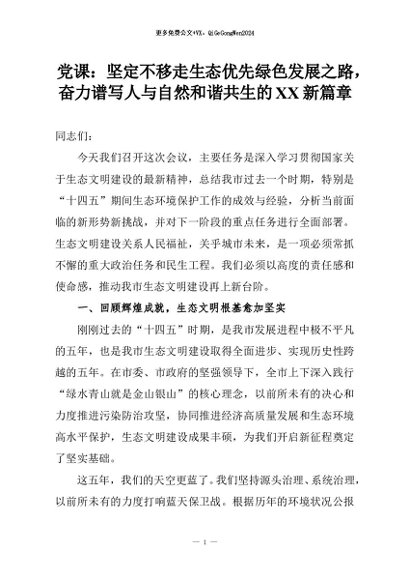 【七哥公文】2026年:党课:坚定不移走生态优先绿色发展之路,奋力谱写人与自然和谐共生的XX新篇章+更多免费公文+VX:QiGeGongWen2024